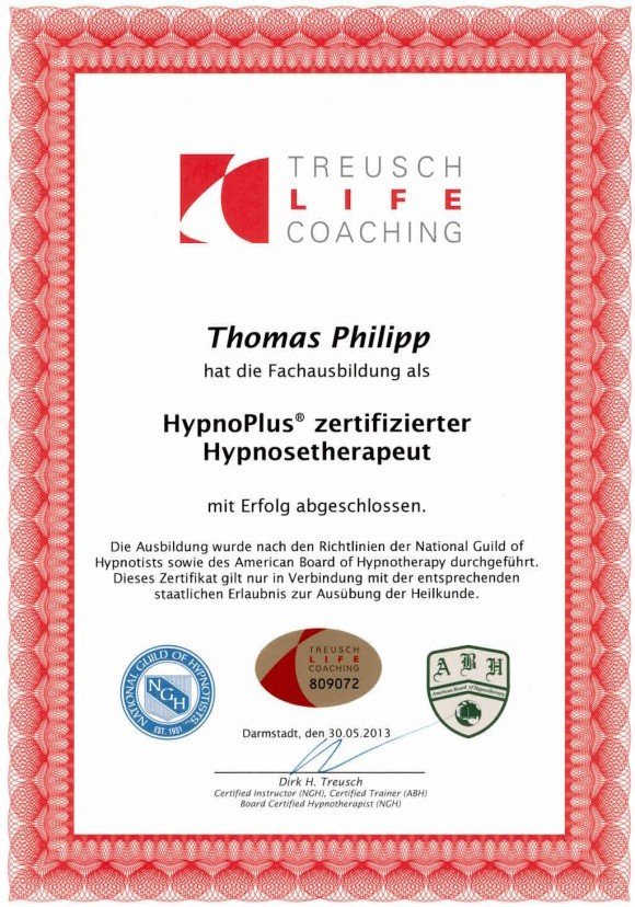 Ich bin ausgebildeter und zertifizierter HypnoPlus-Hypnosetherapeut sowie Hypnose-Coach, Mitglied der National Guild of Hypnotists und zusätzlich für die Hypnosebehandlung bei Depressionen zertifiziert. Diese Spezialisierung ist besonders wertvoll, da Ängste und depressive Verstimmungen oft Hand in Hand gehen. Auch im Bereich NLP bringe ich viel Erfahrung mit: Ich bin NLP-Master nach DVNLP sowie lizensierter NLP-Practitioner. Darüber hinaus habe ich mehrere Ausbildungen zum Practitioner für angewandte Kommunikationstechniken und Veränderungsmodelle erfolgreich abgeschlossen.